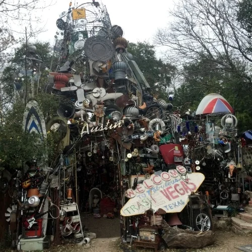 Austin seems proud of all of its quirks and weirdness, so I thought our final day in the city should embrace this trend we'd been finding everywhere. I recommended we check out the Cathedral of Junk, a spectacular shrine of discarded materials shaped into a massive structure that has caverns, balconies, and staircases. Built in a man's backyard on the south side of Austin, the Cathedral of Junk is the kind of place you have to visit to truly understand what it's all about. Constructed from baby doll heads, crutches, cds, street signs, hubcaps, piggy banks, typewriters, bicycles, and anything else you can imagine, it's a magnificent temple of the bizarre. I was honestly perplexed we didn't have to sign a liability waiver to climb atop this castle of crap.