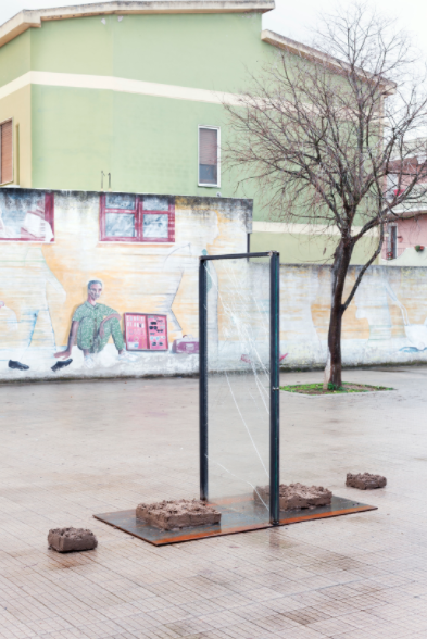 Site specific installation. Permanent structure: steel, shattered laminated glass H79 x W39 x D79 inches. Ephemeral elements: squared blocks of dirt and straw forming two symmetrical archipelagos, assembled with a traditional technique called "terra cruda," multiple sizes from 24x24 inches to 8x8 inches.